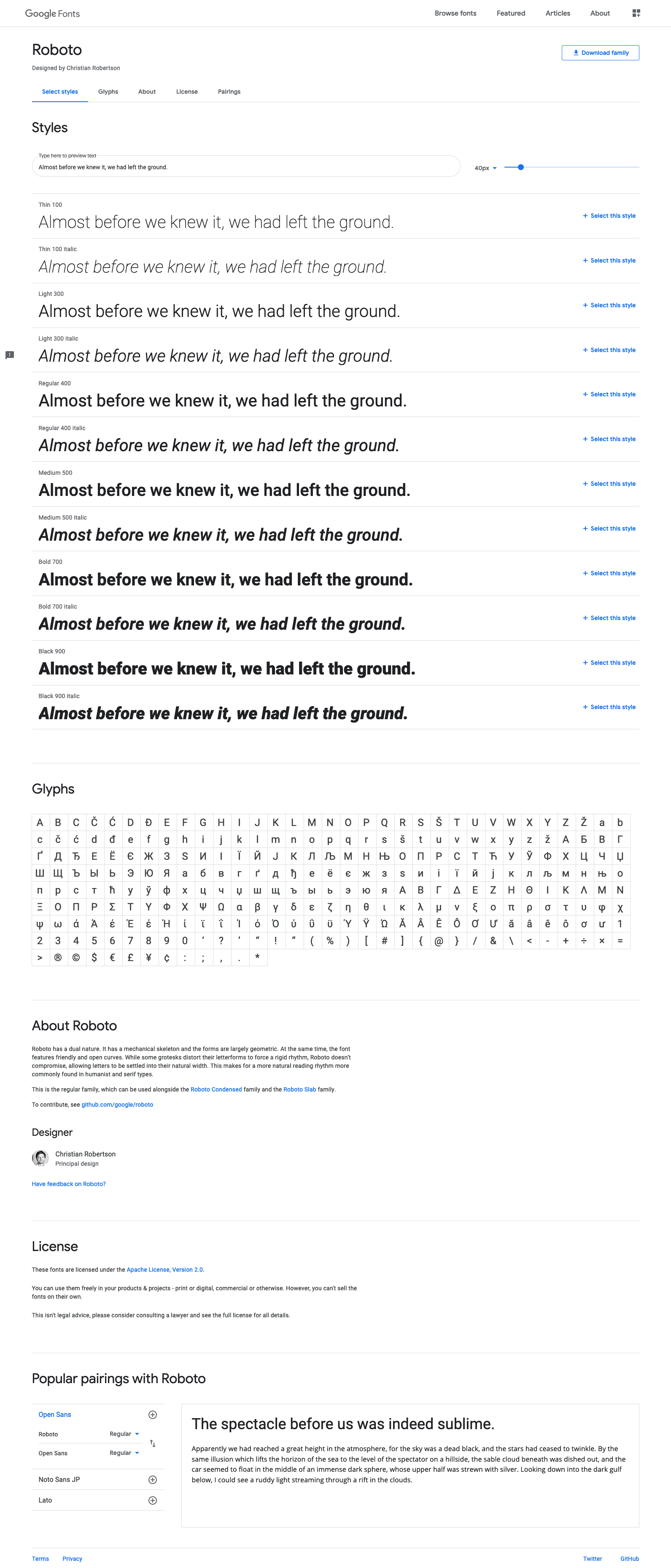 La première étape est assez simple, il suffi de se rendre sur le site googlefonts. Une fois sur la page, vous avez accès à l’ensemble des typographies proposées par Google. Ces typographies peuvent contenir un certain nombre de déclinaisons allant de la version « thin » à « black ». Il n’y a qu’a faire son choix.