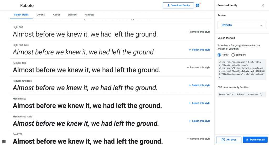 Il vous est possible de choisir une ou plusieurs déclinaison de la typo. Pour notre exemple nous choisirons la version « light300 », « regular400 » et « bold700 » en cliquant sur le bouton bleu « + select this style« . Il est important de limiter son choix aux seules versions utilisées dans nos pages de manière à ne pas surcharger inutilement notre site web.