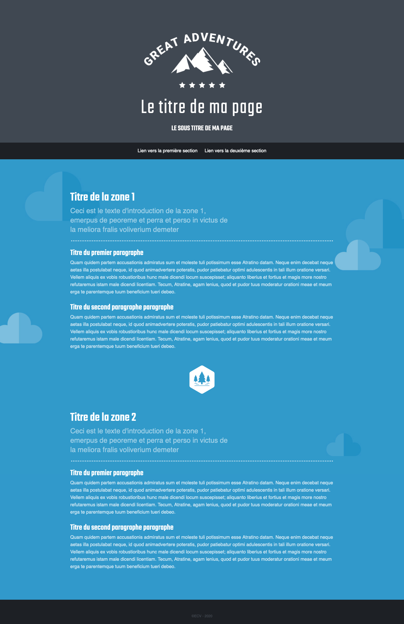 Comme pour le header de notre page, nous allons pouvoir envelopper la liste définissant le menu à l’aide d’une balise de regroupement <nav> à laquelle nous appliquerons l’attribut class="primary_nav". Les liens href sont définis comme « ancre nommée », c’est à dire qu’il permettrons de faire défiler la page pour afficher la zone possédant l’identifiant cité. Par exemple en cliqueant sur le premier lien ( href="#zone_1") nous descendrons notre page jusqu’a l’élément aillant l’attribut id="zone_1".