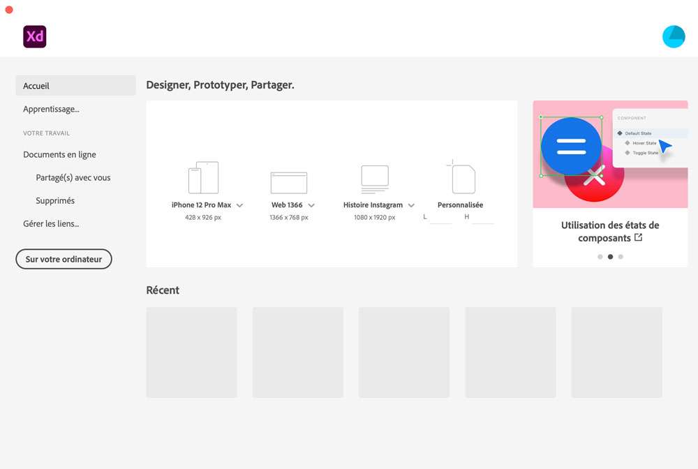 Selon son éditeur, “ Adobe XD est la solution la plus rapide pour créer, prototyper et partager des expériences utilisateur : sites web, applications mobiles, interactions vocales, etc.”