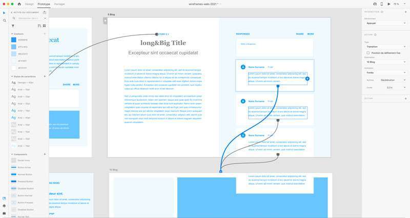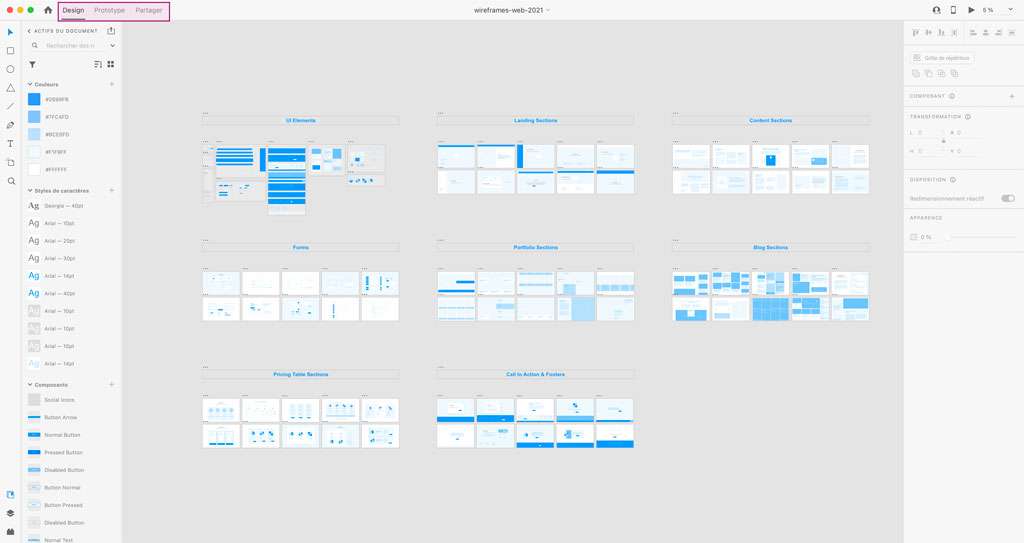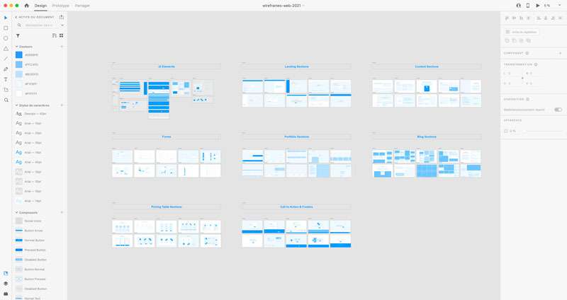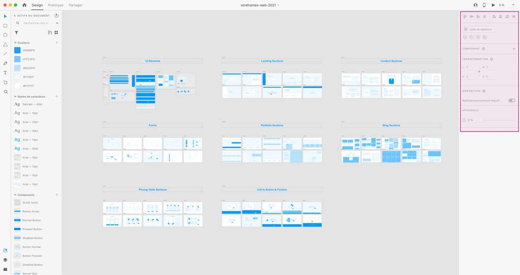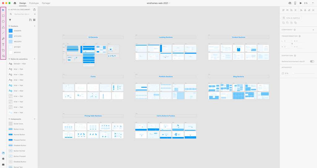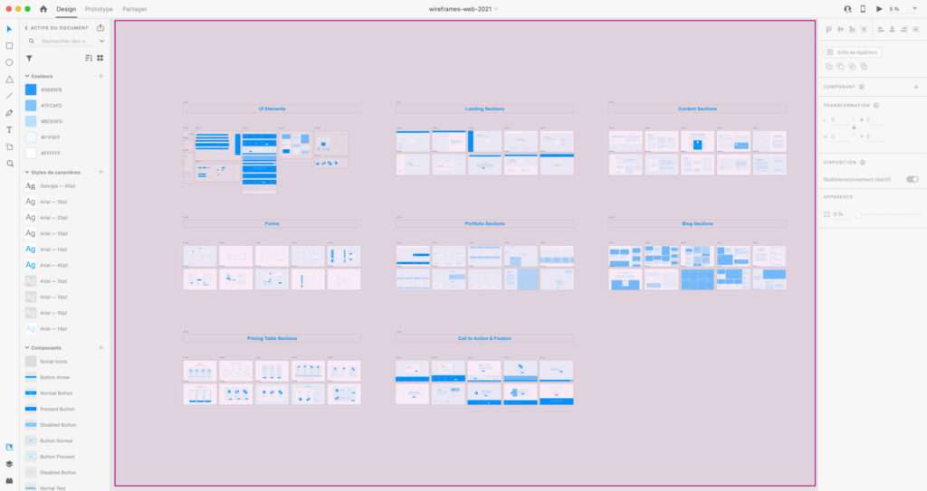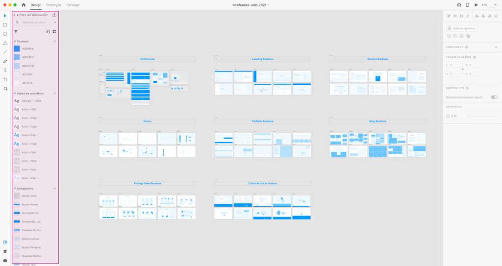 Toujours sur la gauche de notre écran, nous trouvons une colonne (initialement vide) regroupant l’ensemble des éléments de bibliothèque de notre document. Couleurs, typo et styles typographiques, composants d’interface sont autant d’éléments enregistrés que vous pourrez utiliser dans l’ensemble des pages de votre projet. Cette bibliothèque vous permettra de travailler les différents pages ou zones de votre wireframe en gardant une cohérence globale. Lors de la phase d’intégration elle offrira un support essentiel pour définir les styles présents dans votre interface.