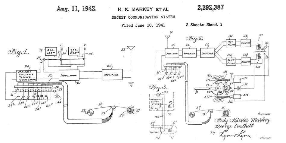 Hedy Lamarr avait connaissance des techniques de guidages des torpilles allemandes depuis son mariage avec le vendeur d’armes Fredrich Mandl. George Antheil de son côté connaissait les systèmes de contrôle automatiques et les séquences de sauts de fréquence des pianos à rouleaux mécaniques qu’il utilisait pour la composition musicale. À eux deux, ils développent un système permettant d’émettre un signale de guidage sécurisé applicable aux torpilles radio-guidées pour permettre au système émetteur-récepteur de la torpille de changer de fréquence. Ce procédé novateur permettait de rendre pratiquement impossible la détection d’une attaque sous-marine par l’ennemi.