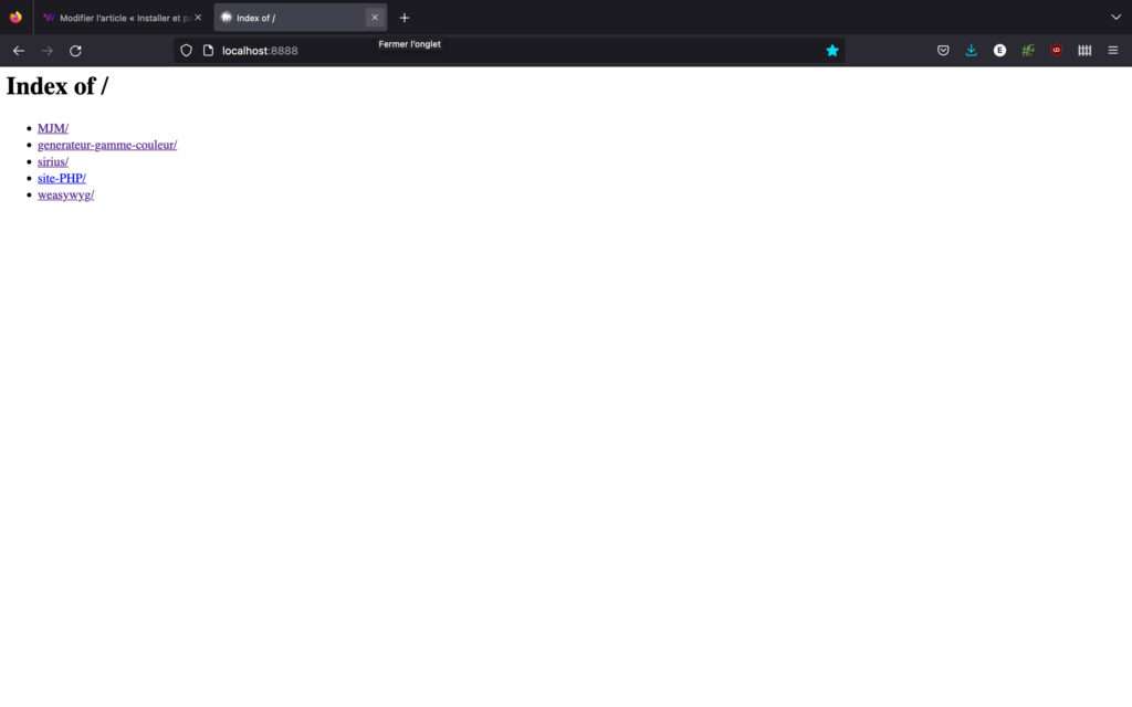 Depuis cette adresse, vous accèderez à la liste des sites présents dans le dossier racine. Vous pourrez ainsi naviguer d’une page à l’autre et tester vos scripts.