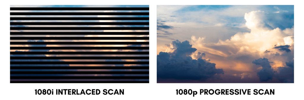 Le choix entre 1080P (progressif) et 1080i (entrelacé) dépend de l’effet souhaité. Le balayage progressif affiche l’image en une seule fois, tandis que l’entrelacement alterne lignes impaires et paires pour doubler la fréquence d’images.