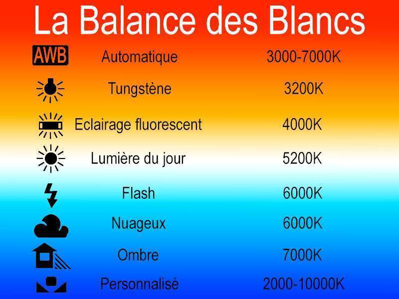 La couleur de la lumière varie en fonction des conditions. La balance des blancs ajuste les couleurs pour maintenir la cohérence. Elle peut être automatique ou manuelle, en utilisant une référence blanche.
