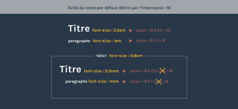 Son utilisation en CSS est assez simple, la première chose a comprendre est la valeur du cadratin racine (root em). Cette valeur est celle définie par l’internaute dans les propriétés de son navigateur. Il correspond visuellement au corps donné à un paragraphe (<p>) enfant direct du <body>. En partant de cette valeur, nous pourrons par exemple définir la valeur donnée au corps d’un titre de niveau 1 (<h1>) en spécifiant qu’il devra être 2,5 fois plus grand. Ainsi pour un corps par défaut défini à 16, notre élément titre héritera d’un corps de 40. Si notre internaute change la valeur par défaut en la passant à 24, notre élément <h1> fera 60 et ainsi de suite.