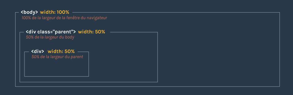 Le pourcentage est une unité connue et très simple à mettre en œuvre mais présentant quelques limites. Il ne pourra être calculé par notre navigateur que pour les valeurs horizontales (sauf dans certains cas bien précis). Ainsi, la majorité du temps, nous ne pourrons pas définir la hauteur, les marges supérieures ou inférieures d’un élément en pourcentage. Il a pour principe de s’appuyer sur la largeur de l’élément parent de l’élément ciblé.