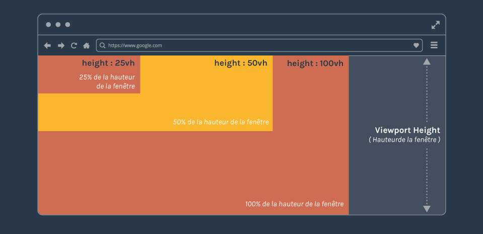 À l’instar du viewport widtg vu précédemment, le viewport height s’appuiera sur la hauteur de la fenêtre du navigateur. Ainsi, il sera possible de définir la hauteur d’un élément à 80vh pour qu’il fasse 80% de la hauteur de la fenêtre du navigateur.