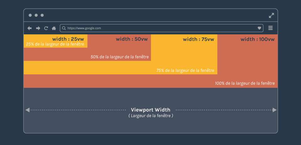 Avant toute chose, il est important de définir ce qu’est le viewport. Il s’agit simplement de la fenêtre de notre navigateur dans laquelle apparait notre site. Depuis quelques années, certaines unités s’appuient sur la taille que l’internaute donne à cette fenêtre. Lorsque nous utilisons l’unité vw (viewport width) nous définissons la taille d’un élément par rapport à la largeur de cette fenêtre. Ainsi, lorsque nous attribuons une largeur de 50vw à un élément, nous lui donnons l’indication qu’il devra mesurer 50% de la largeur de la fenêtre.